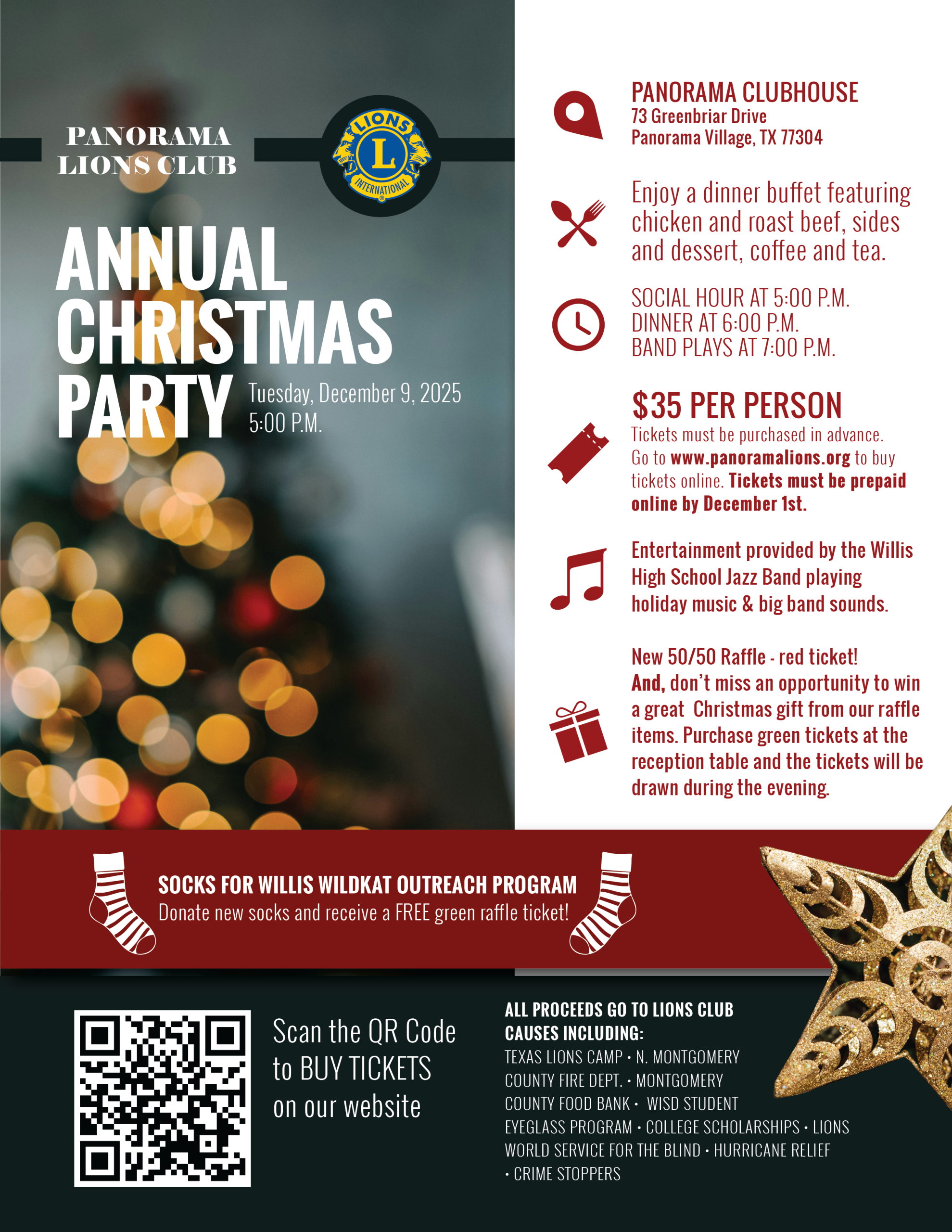 Enjoy an evening of fun, food and fine music. Come join us at our 2025 Panorama Christmas Party with the Willis High School Jazz Band. Don’t miss the raffles so bring extra cash!